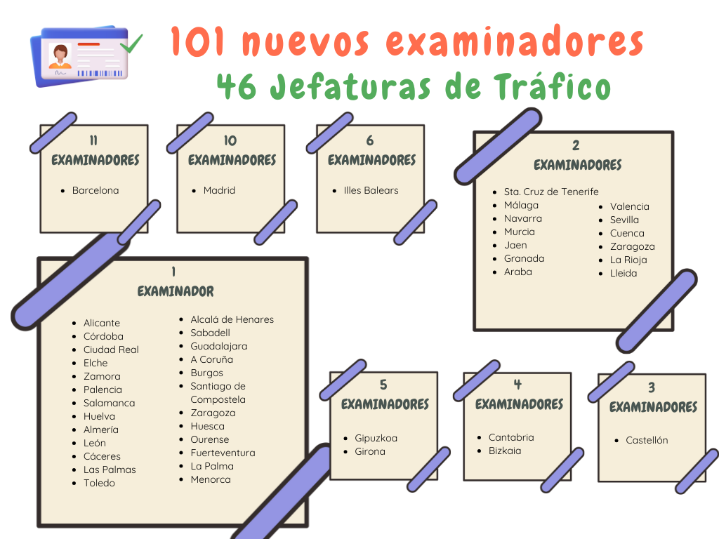 Estas incorporaciones forman parte del compromiso de la Dirección General de Tráfico para aumentar la capacidad de examinar en algunas jefaturas concretas, intentando maximizar los recursos disponibles con la demanda del servicio y poder así mejorar la capacidad y el día a día de los exámenes en cada provincia. El reparto de funcionarios es el que muestra la siguiente ilustración.