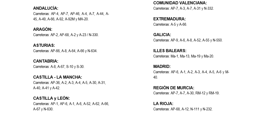 Por Comunidades Autónomas, las carreteras que se verán afectadas con una mayor intensidad de tráfico serán las siguientes: