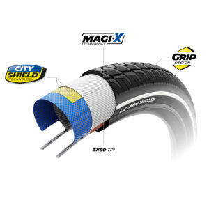 La prioridad de los ciclistas urbanos es que sus neumáticos sean resistentes a los pinchazos. Para cumplir con esta premisa, Michelin ha desarrollado la tecnología City Shield, con cinco capas que refuerzan la carcasa del neumático. Esta construcción exclusiva permite que el nuevo MICHELIN City Touring ofrezca un 53% más de protección contra los pinchazos en la banda de rodadura y un 11% más de protección contra la perforación en los flancos en comparación con su predecesor, el MICHELIN Protek Cross Max3,4.